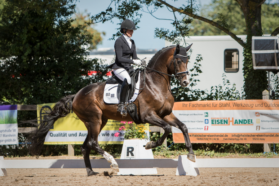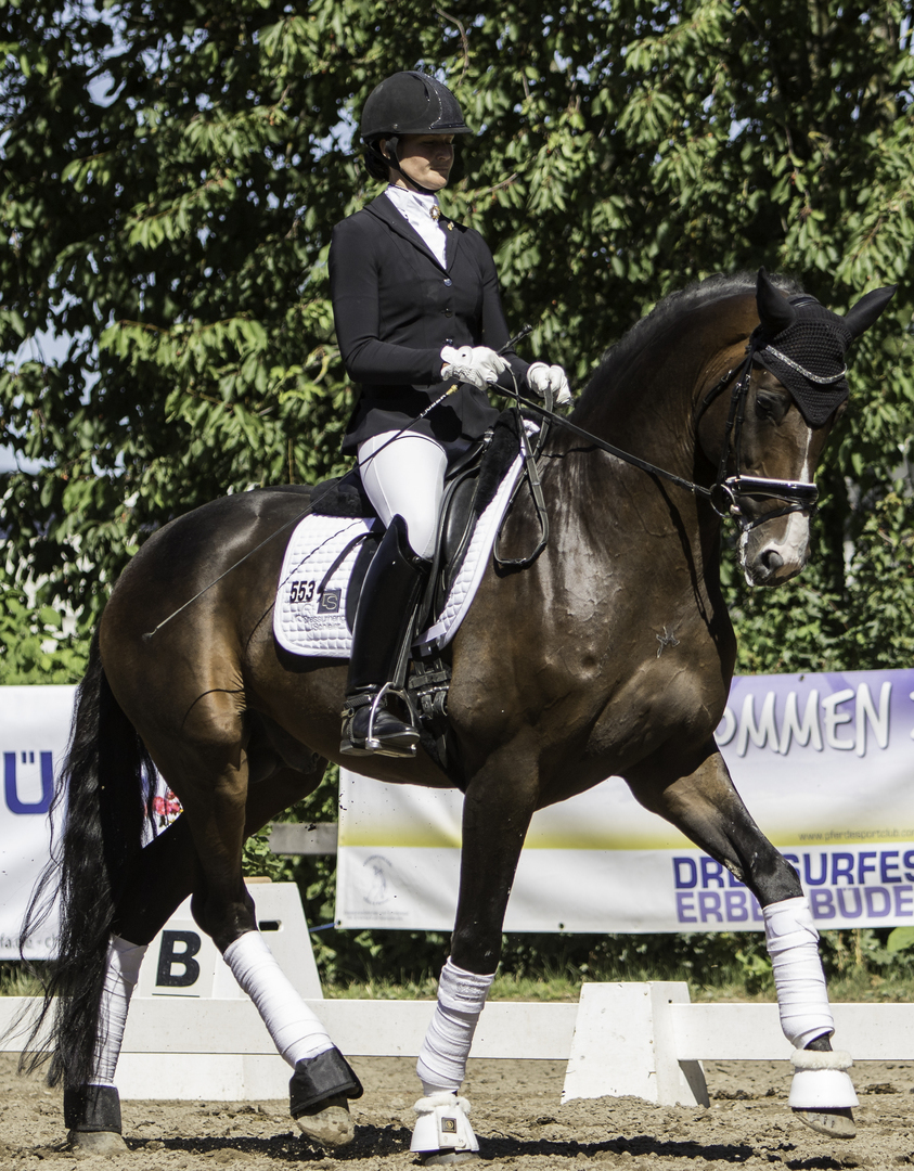 Am 01. Juli 2018 präsentierte sich DSP De Sandro (Decurio - Samba Hit), unser zweifacher Süddeutscher Champion und Bundeschampionat-Finalist aus 2017, unter seiner Reiterin Carolin Brandt erneut von seiner spektakulären Seite. Souverän siegte das harmonische Paar in der stark besetzten Dressurpferde L und sicherte sich mit einer verdienten Wertnote von 8,1 (Trab 7,5, Schritt 8,5 / Galopp 8,5 / Durchlässigkeit 8,0 / Gesamt 8,0) das Ticket zum Bundeschampionat der 5-jährigen Dressurpferde in Warendorf. Eine wirklich tolle Leistung, zumal Carolin Brandt den jungen Hengst erst seit ein paar Wochen auf dem Burghof trainiert. Wir sind sehr stolz auf unser neues Dreamteam, sagen DANKE und freuen uns schon jetzt auf den Auftritt der beiden beim Bundeschampionat.
