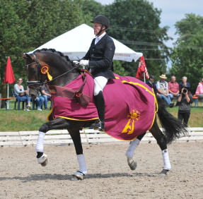 Sichtlich gereift, konnte der imposante Hengst das Richtergremium sowohl in der Einlaufprüfung als auch im Finale von seiner überragenden Qualität überzeugen. Trotz wilder Wetterkapriolen lieferte DSP De Sandro in beiden Prüfungen eine ebenso souveräne, wie ausdrucksstarke Leistung ab. In der Einlaufprüfung siegte er mit 8,5 und konnte dieses Ergebnis im Finale sogar noch steigern, das er mit einer hervorragenden Wertnote von 8,6 (Trab 8,0 / Galopp 8,5 / Schritt 9,0 / Ausbildung 8,5 / Gebäude 9,0) für sich entschied.