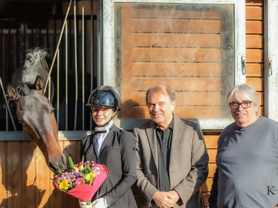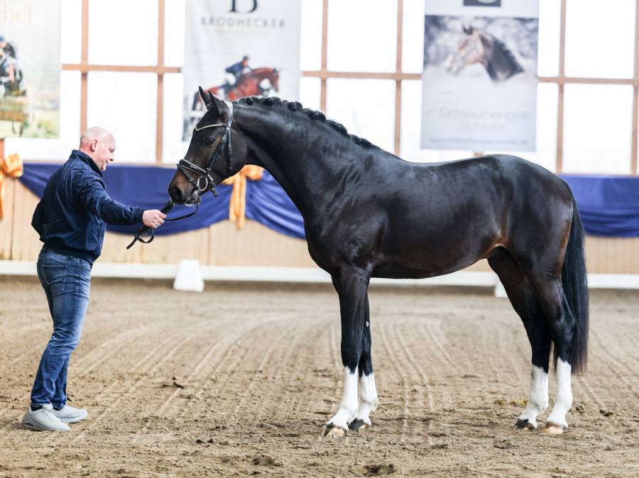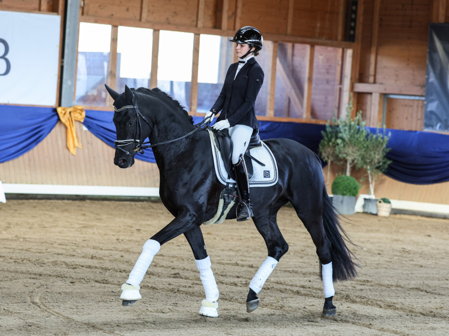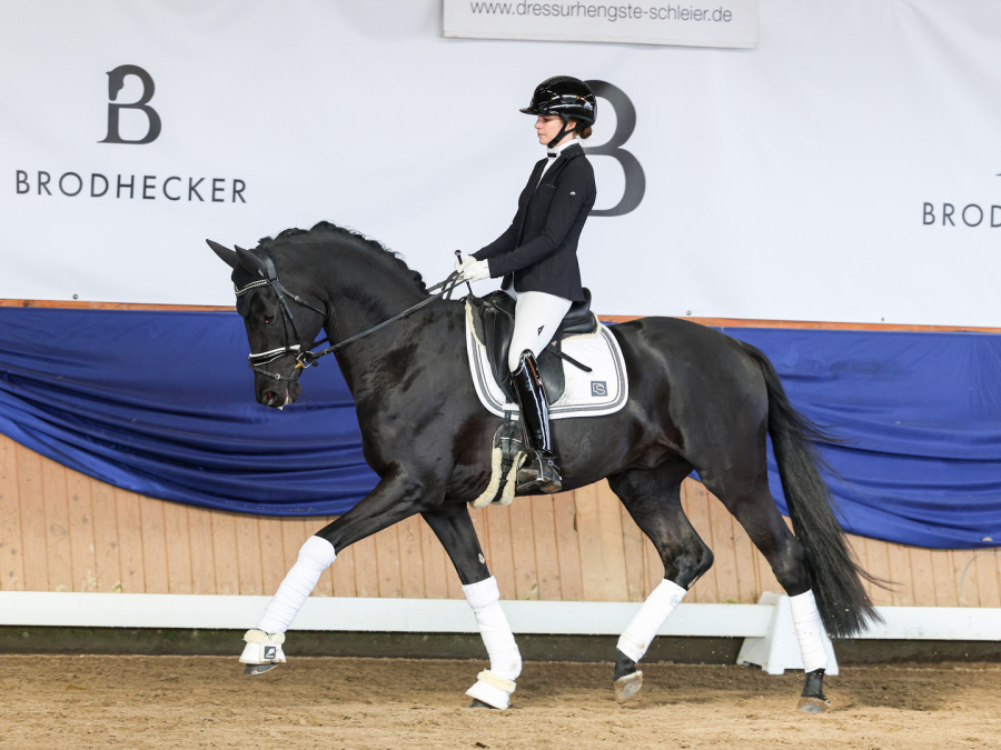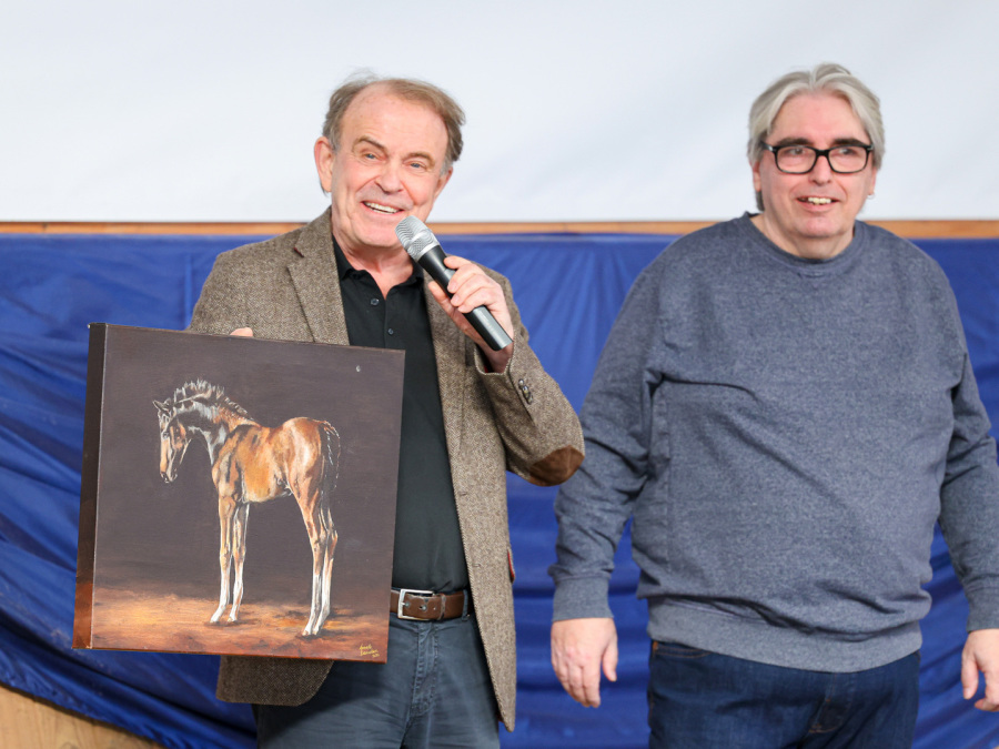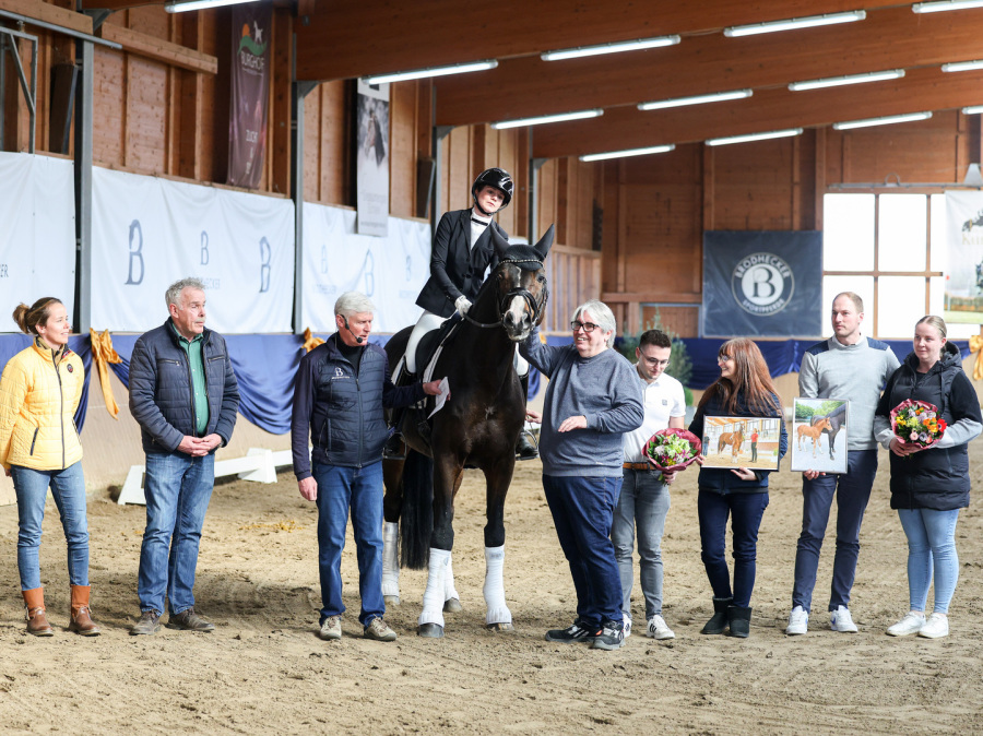Als besonderes Highlight wurde der erste Sattel-Live-Auftritt von Top-Neuzugang Fontainebleau l'ami (For Romance I x Christ / Züchter: Thomas Ehrengut) mit großer Spannung erwartet. Zunächst an der Hand vorgestellt, begeisterte der 3-jährige Hannoveraner Prämienhengst sowohl durch sein makelloses Exterieur als auch durch seine bemerkenswerte Gelassenheit. Dieses Bild wurde dann später unter Bereiterin Leandra Hahn noch abgerundet. Hier beeindruckte der junge Hengst durch seine herausragende Mechanik und seine enorme Rittigkeit, die er nach nur wenigen Wochen unter dem Sattel bereits souverän zur Schau trug. Auch der stolze Züchter Thomas Ehrengut ließ es sich nicht nehmen, bei diesem besonderen Moment dabei zu sein. Er hob erneut die überragende Qualität dieses Ausnahmehengstes hervor, der bereits als Fohlen auf der Fohlenschau des Artlenburger Pferdezuchtverbands für Furore sorgte. Mit 59,5 (5x 10, 1x 9,5) von 60 möglichen Punkten, erzielte er die beste Bewertung, die jemals ein Fohlen auf dieser beliebten Schau erzielen konnte. Als Überraschung überreichte er Joachim Schleier ein Bild von Fontainbleau l'ami im Fohlenalter - eine tolle Geste, die nicht nur Familie Schleier begeisterte.