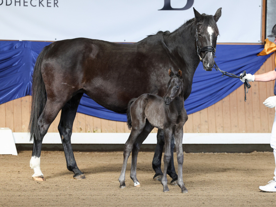 Auch unser 4-jähriger Junghengst Maddox (Millennium x Donnerhall / Züchter: ZG Rösch u. Küster) sorgte während seines sehr gelungenen Auftrittes für Begeisterung und erntete dafür viel Applaus. Der lackschwarze Strahlemann überzeugte neben seiner eleganten Erscheinung, besonders durch seine elastische Mechanik und seine hervorragende Rittigkeit. Ganz besonders freuten wir uns darüber, dass wir auf der Hengstschau auch Maddox ersten Nachkommen vorstellen durften. Ein typstarkes Hengstfohlen (Maddox x Laurice), das zwei Tage zuvor auf dem Burghof geboren wurde.