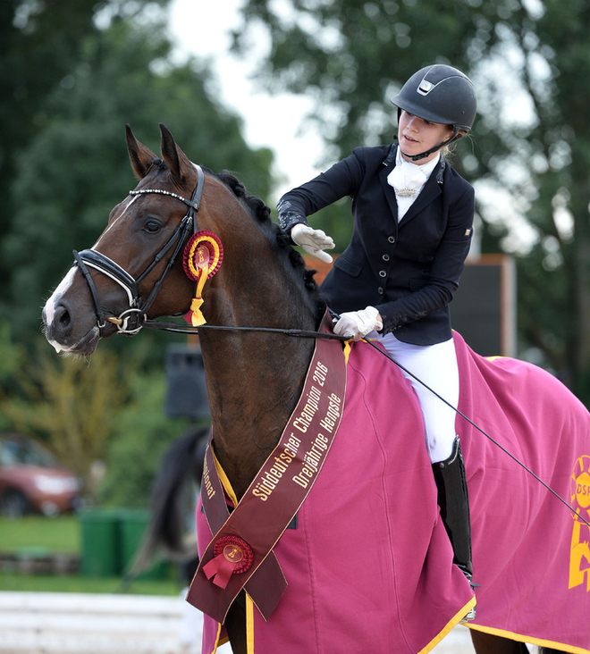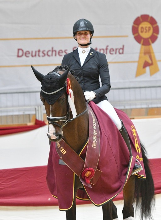 2018 + 2019: In den beiden Folgejahren sicherte sich DSP De Sandro unter Carolin Brandt auch bei den 5- und 6-Jährigen (Wertnote 8,1 und 8,0) die begehrte Siegerschärpe und knackte damit gleich zwei Rekorde und setzte damit Maßstäbe für viele zukünftige Championats-Aspiranten. Vor ihm hatte noch kein Süddeutsches Sportpferd mehr als zwei Championatssiege hintereinander für sich entscheiden können und ihm gelang es insgesamt viermal in Folge.