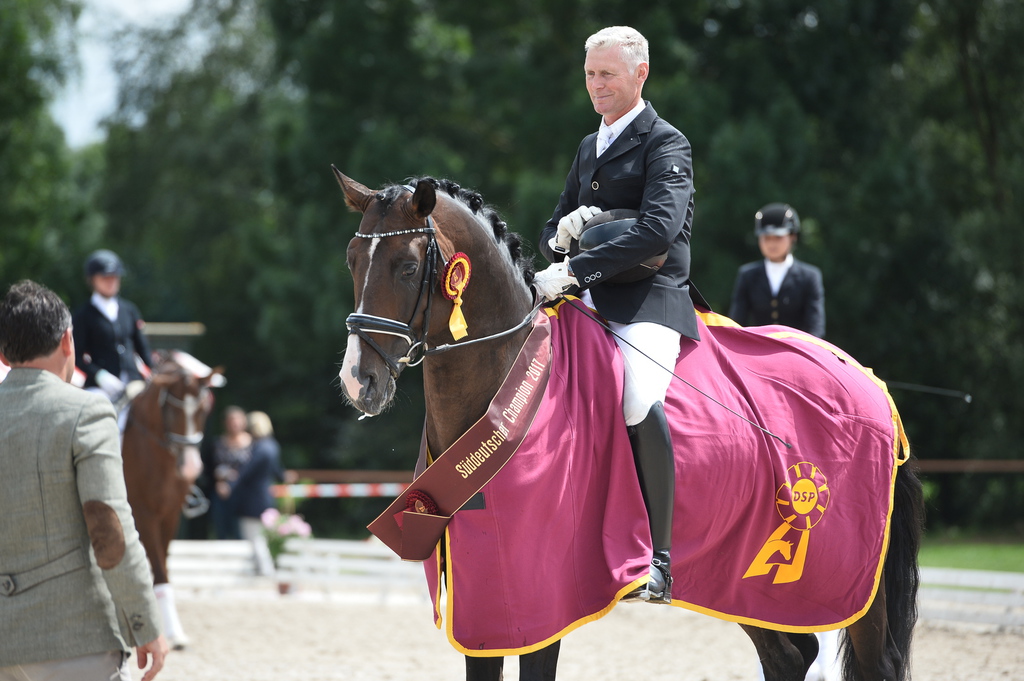 2017: Ein Jahr später wiederholte DSP De Sandro seinen furiosen Erfolg und wurde Süddeutscher Champion der 4-jährigen Hengste. Sichtlich gereift überzeugte er unter Burghof-Chef Volker Brodhecker sowohl in der Einlaufprüfung (Wertnote 8,5) als auch im Finale, das er mit 8,6 (Trab 8,0 / Galopp 8,5 / Schritt 9,0 / Ausbildung 8,5 / Gebäude 9,0) für sich entscheiden konnte.