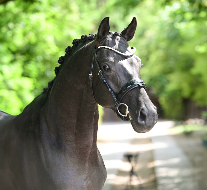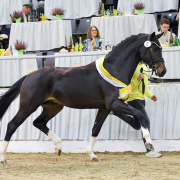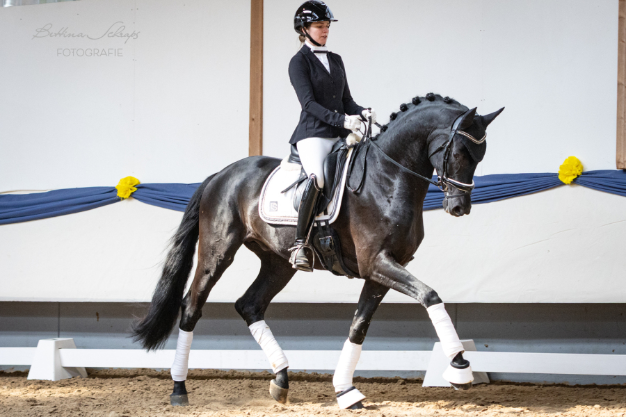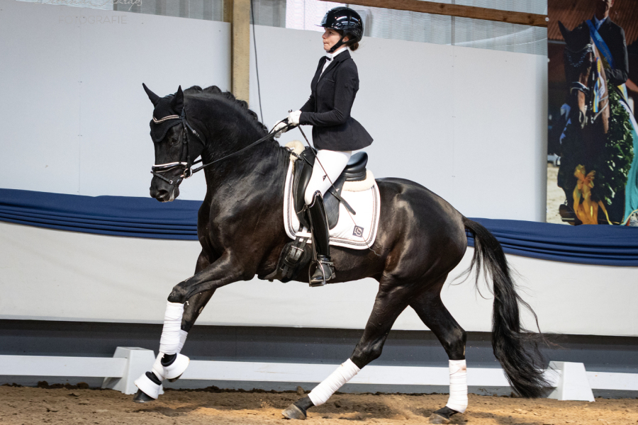 Hier beeindruckte der lackschwarze Junghengst mit seiner locker durch den Körper schwingenden Elastizität, seiner bemerkenswerten Taktsicherheit und seiner tollen Leistungsbereitsschaft, so dass er verdientermaßen mit einem positiven Körurteil belohnt wurde.
